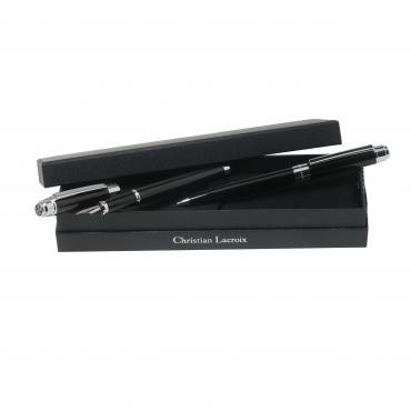 Zestaw z mosiądzu, lakierowany, na który składa się piszący na niebiesko długoips i piszące na niebiesko pióro wieczne. Całość pakowana w czarne pudełko ozdobne.