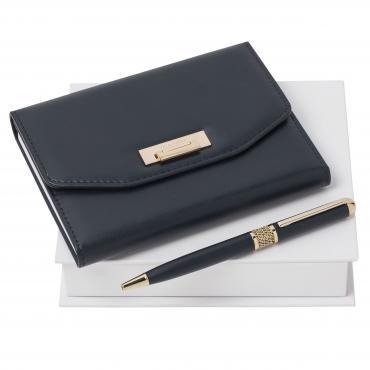 Subtelny zestaw dla pań, składający się z notesu A6 (okładka z PU, 80 kartek) i piszącego niebieskim tuszem długopisu z mosiądzu. Całość pakowana w pudełko ozdobne.