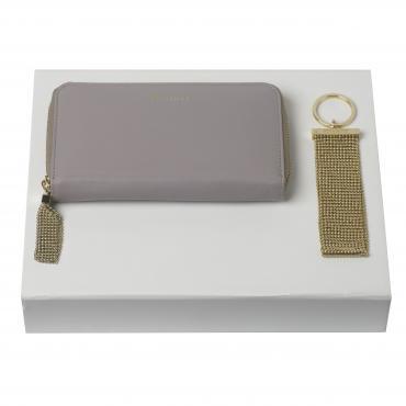 Zestaw brelok (pozłacany mosiądz, wymiary: 30 x 5 x 110 mm, kółko: 23 mm) i etui na iphone (skóra, wymiary: 156 x 95 x 19 mm).