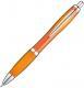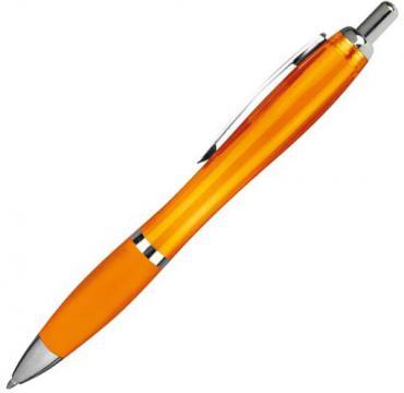 Plastikowy długopis transparentny z dużym, niebieskim wkładem. Produkt wyposażony w srebrny, metalowy klip oraz gumkę ułatwiającą trzymanie. Logotyp nadrukujemy na korpusie długopisu z prawej strony klipu.
