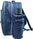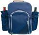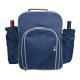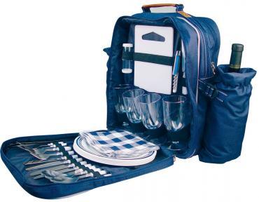 Plecak piknikowy z wyposażeniem dla 4 osób. Zawiera komory chłodzące na jedzenie oraz butelki, plastikowy zestaw naczyń i sztućców, małą deskę, korkociąg, pojemniczki na pieprz i sól oraz nóż.