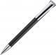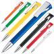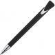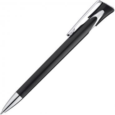 Plastikowy długopis z nowoczesnym, chromowanym klipem i dużym, niebieskim wkładem.