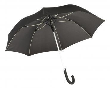 Automatyczny parasol CANCAN z metalową laską oraz kolorowymi szynami z segmentami z włókna szklanego, metalowymi kolcami, wykończona gumą laska z wbudowanym kolorowym automatycznym przyciskiem, poszycie z poliestru pongee i paskiem spinającym zapinanym na rzep.