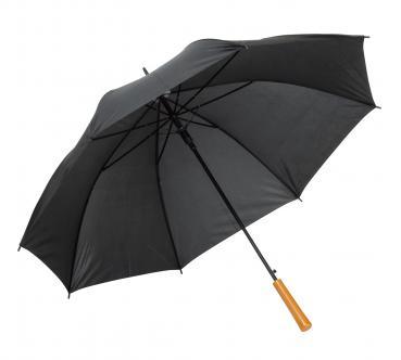 Automatyczny parasol LIMBO z metalową laską i szynami oraz plastikowymi kolcami dopasowanymi kolorystycznie, uchwyt z drewnopodobnym wykończeniem, poszycie poliestrowe, zamknięcie na rzep Velcro.