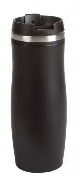 Kubek termiczny o podwójnych ściankach DARK CREMA , wewnątrz i na zewnątrz stal nierdzewna, odkręcana plastikowa pokrywa z wbudowanym, składanym otworem do picia, kolorowy gumowy pierścień wokół otworu i gumowany spód dla lepszej przyczepności, pojemność ok. 400 ml.