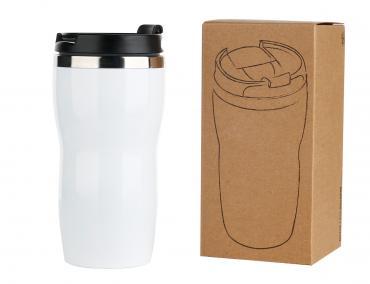 Kubek termiczny, metalowy z podwójnymi ściankami (biały na zewnątrz) o poj. 400 ml. Posiada zakrętkę w kolorze czarnym. Logotyp można umieścić bezpośrednio na produkcie.