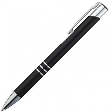 Klasyczny długopis metalowy z chromowanymi elementami i smukłym klipsem. Długopis wyposażony w duży niebieski wkład. Logotyp można umieścić pod klipem.