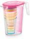 Doskonały do przygotowywania i podawania orzeźwiających napojów z wyjmowaną wkładką do zaparzania owoców, ziół, warzyw itp. Cztery kubki z wieczkiem chroniącym napoje przed owadami, z otworem na słomki – polecamy słomki myDRINK. Kubki i wieczka można wkładać jeden w drugi, po użyciu można przechowywać je w dzbanku. Zestaw został wykonany z wysokiej jakości wytrzymałego plastiku. Można myć w zmywarce. Gwarancja 3- letnia.