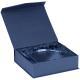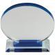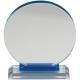 Okrągłe szklane trofeum z solidnym cokołem, zapakowane w ozdobne pudełko z satynową podszewką.