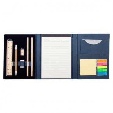 Elegancki składany przybornik w oprawie z kartonu o gramaturze 1200 g/m2. W komplecie: drewniana linijka 15 cm, gumka, długopis, temperówka, 2 ołówki, notes 40 kartkowy w linie o gramaturze 80 g/m2, 25 żółtych karteczek samoprzylepnych (7,5 x 7,5 cm) oraz 25 samoprzylepnych kompletów foliowych zakładek indeksujących po 5 w każdym kolorze. Dodatkowa kieszonka z linijką.