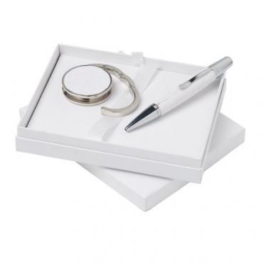 Uroczy i bardzo kobiecy zestaw, delikatnie zdobiony wzorem w kwiaty. Składa się na niego skórzany wieszak na torebkę i mosiężny długopis ze skórzanymi elementami, piszący na niebiesko. Całość pakowana w białe pudełko ozdobne, na którym możemy nadrukować Twój logotyp.